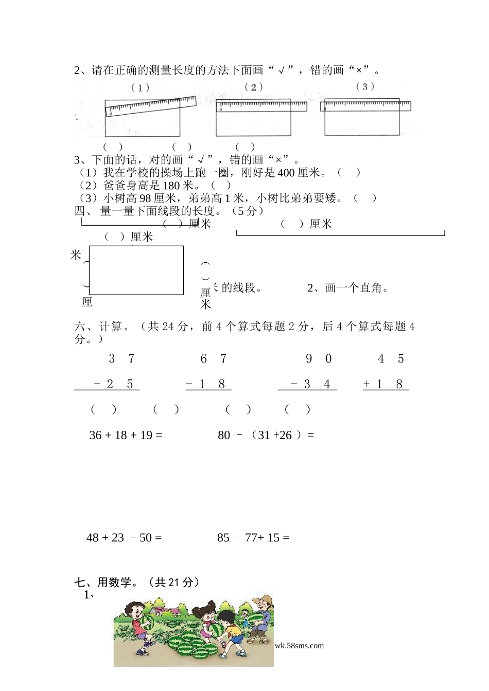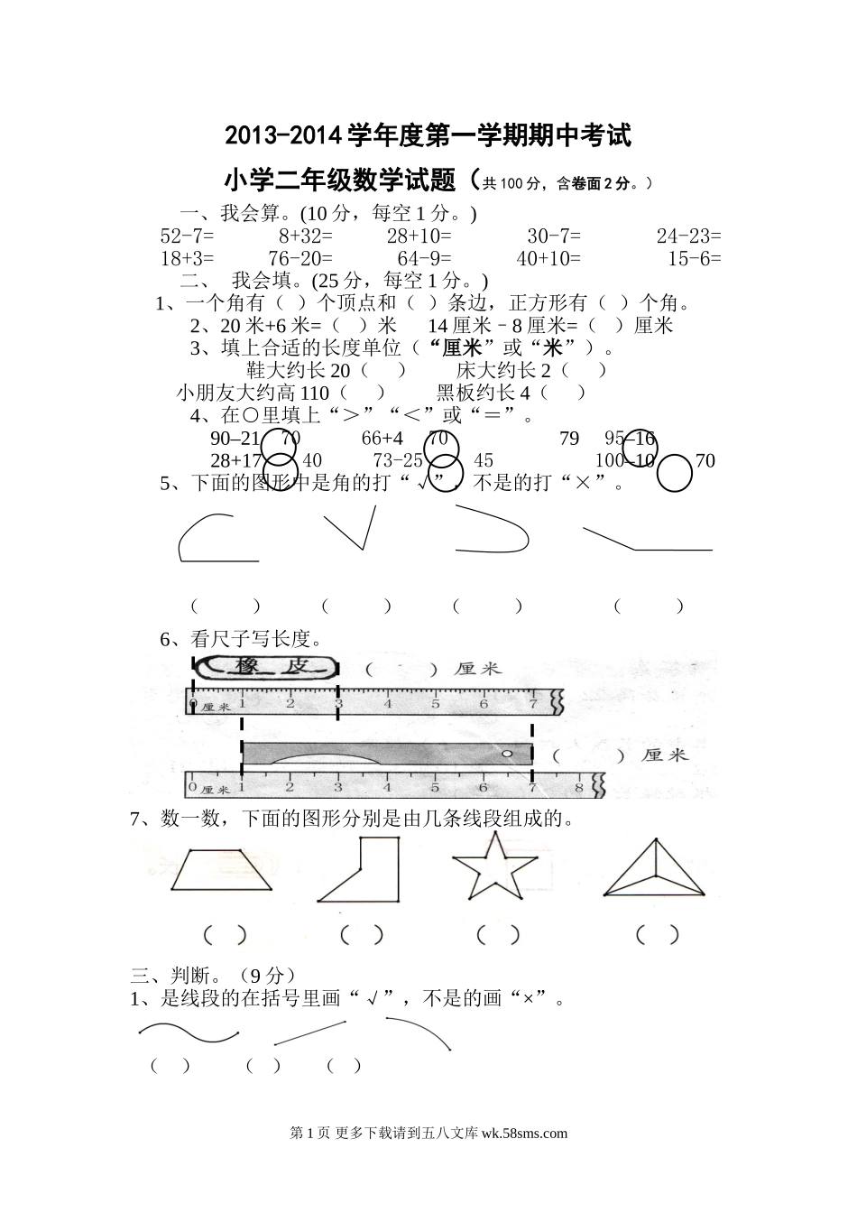 2013-2014学年度第一学期期中考试小学二年级数学试题(共100分,含卷面2分。)一、我会算。(10分,每空1分。)52-7=8+32=28+10=30-7=24-23=18+3=76-20=64-9=40+10=15-6=二、我会填。(25分,每空1分。)1、一个角有...