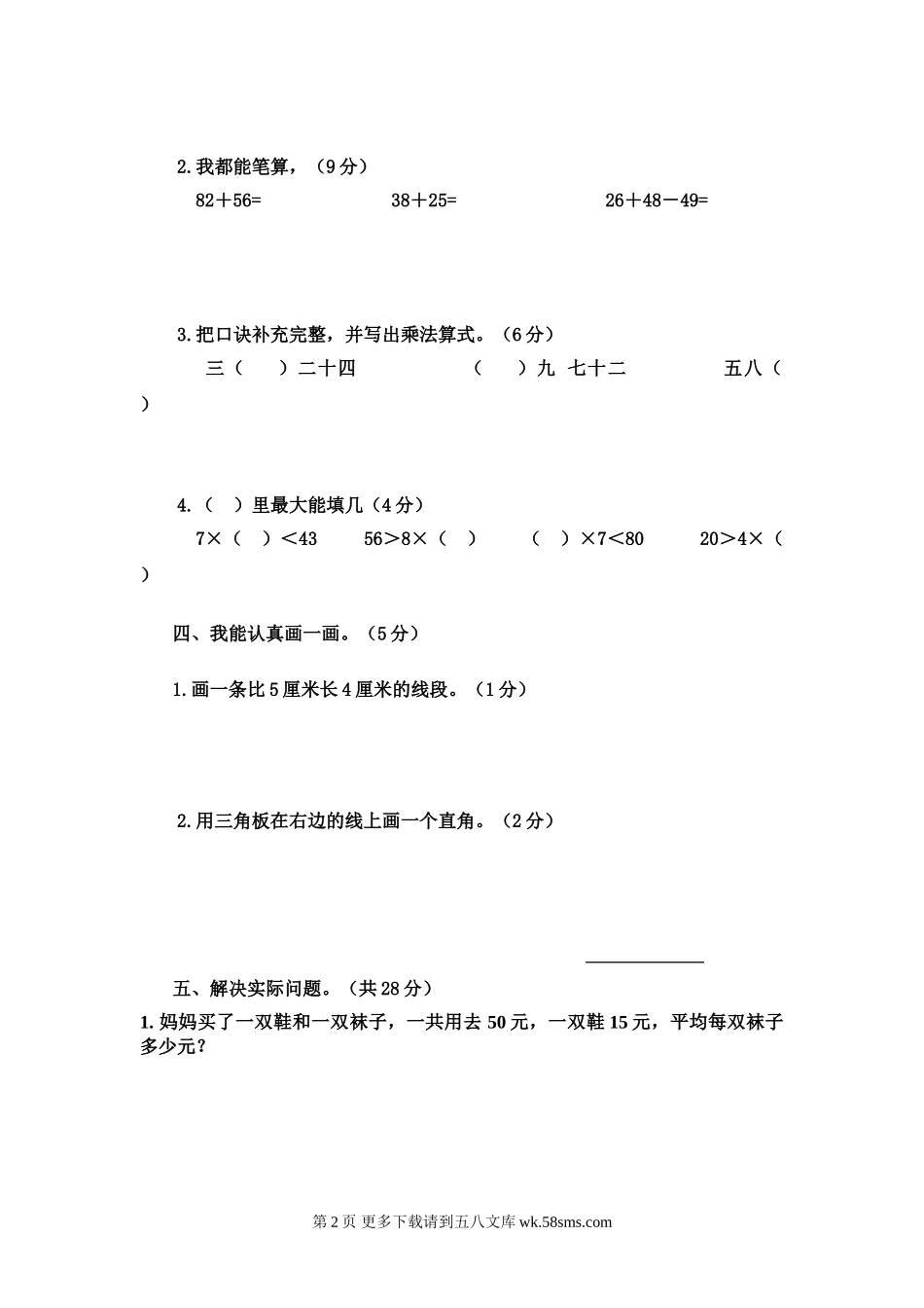 2015年新人教版二年级数学上册期末试题一、填空题:(20×1=20分)1、25厘米+175厘米=()米2、4米=()厘米100厘米=()米3、8+8+8+8是()个(),和是()。4、七八五十六算式是()或()。5、在()里填上...