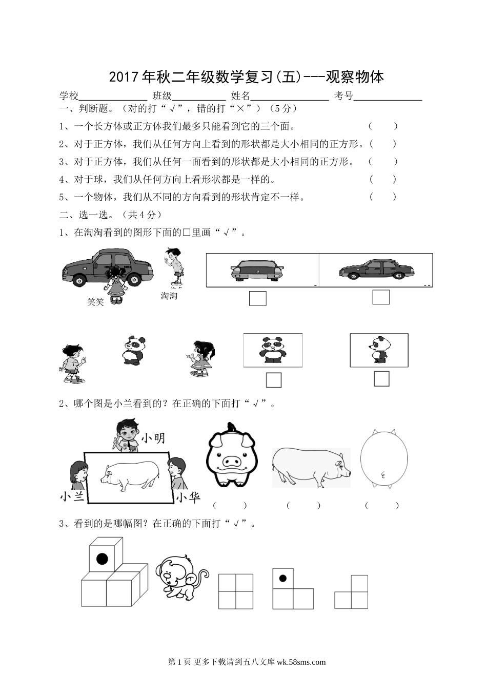 2017年秋二年级数学复习(五)---观察物体学校班级姓名考号一、判断题。(对的打“√”,错的打“×”)(5分)1、一个长方体或正方体我们最多只能看到它的三个面。()2、对于正方体,我们从任何方向上看到的形状...