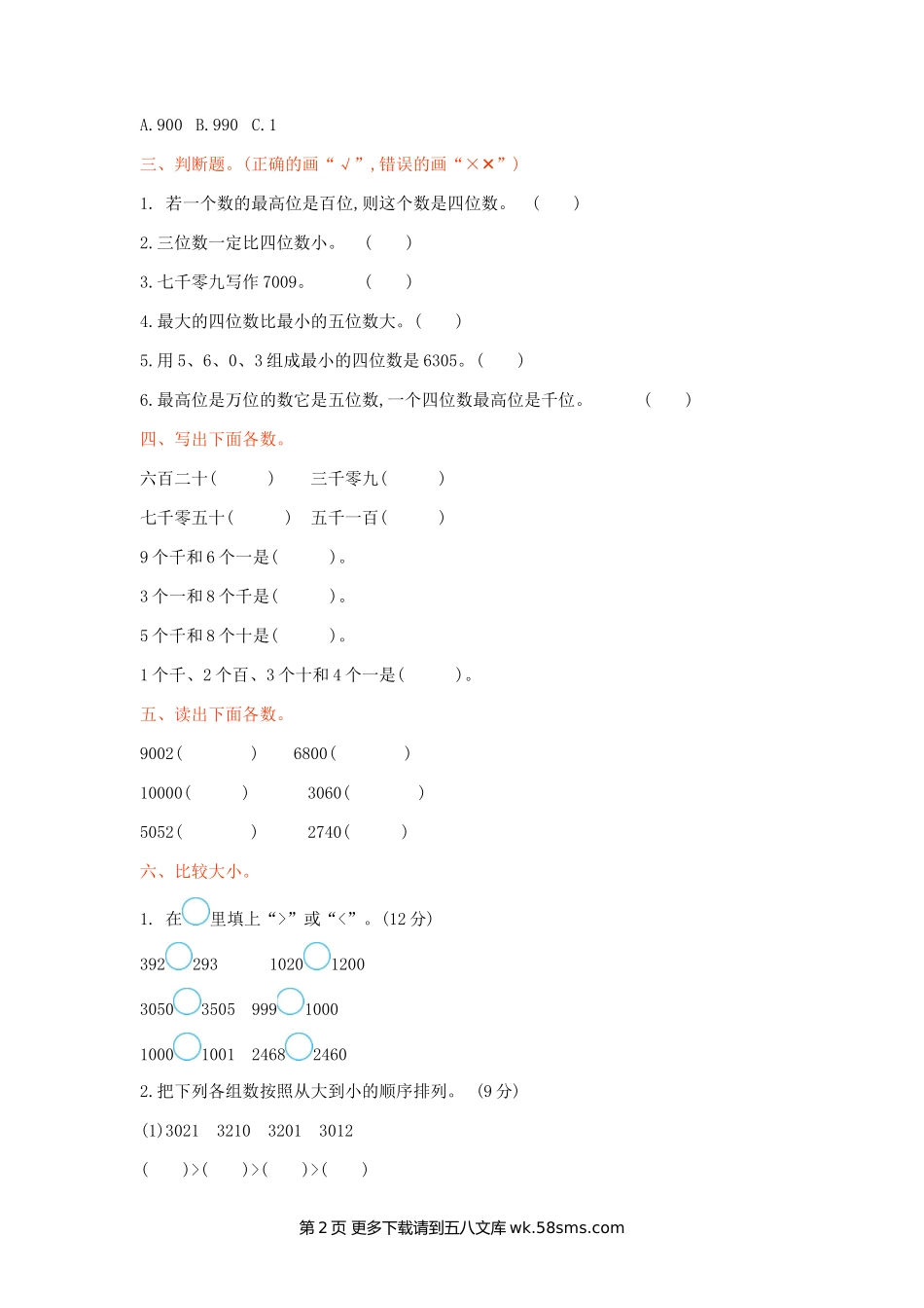 第一单元测试卷一、填空题。1.从个位起,千位是第()位,第五位是()位。2.10个一百是(),10个一千是()。3.一个数由3个千、4个百组成,这个数是(),读作()。4.与9999相邻的两个数是()和()。5.按规律填数。1020,1030,(),1...