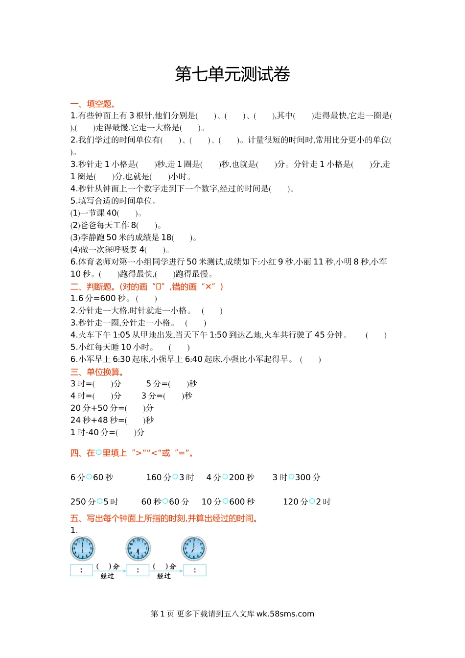 第七单元测试卷一、填空题。1.有些钟面上有3根针,他们分别是()、()、(),其中()走得最快,它走一圈是(),()走得最慢,它走一大格是()。2.我们学过的时间单位有()、()、()。计量很短的时间时,常用比分更小的单位()。3....