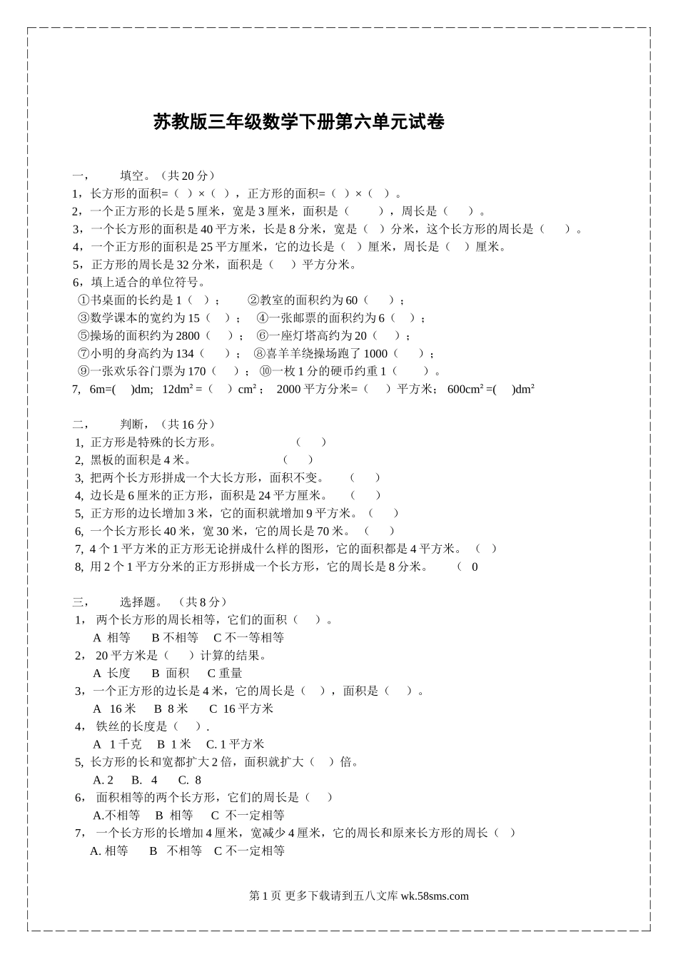 苏教版三年级数学下册第六单元试卷一,填空。(共20分)1,长方形的面积=()×(),正方形的面积=()×()。2,一个正方形的长是5厘米,宽是3厘米,面积是(),周长是()。3,一个长方形的面积是40平方米,...