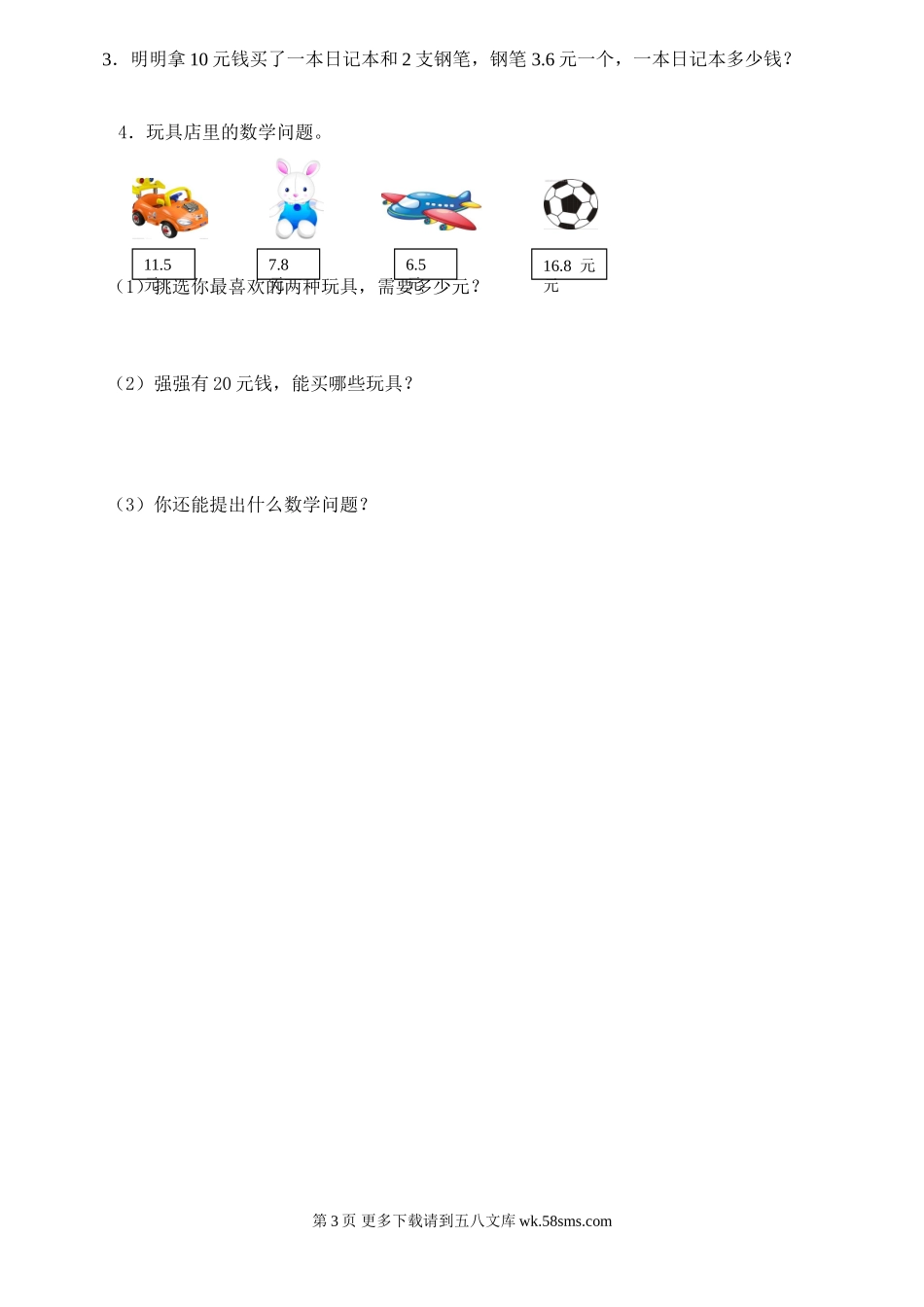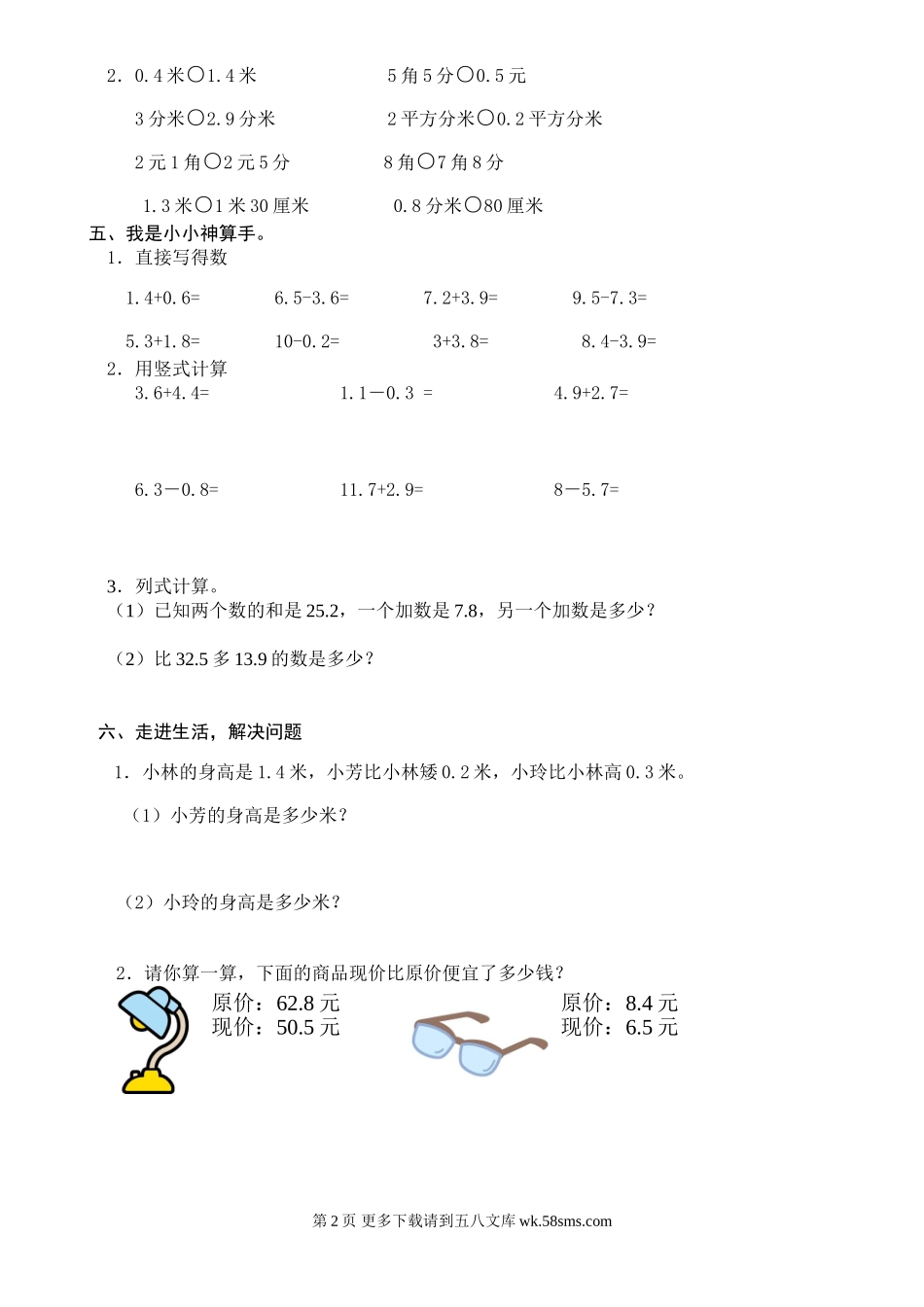 2017-2018学年度下学期单元测试题三年级数学第七单元班级姓名等级一、填一填,我能行!1.大众新型汽车的价钱是八点七万元,写作()万元。2.我的身高是一点四米,写作()米;体重是38.6千克,读作()千克。3...