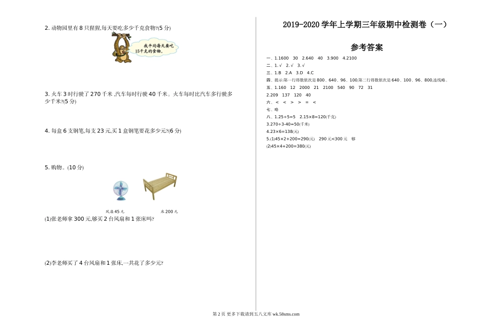 2019-2020学年上学期三年级期中检测卷(一)班级:姓名:满分:100分考试时间:90分钟一、填空题。(12分)1.200和8相乘得(),1乘30得()。2.160的4倍是(),160是4的()倍。3.最小的三位数与最大的一位数相乘,积是()。4...