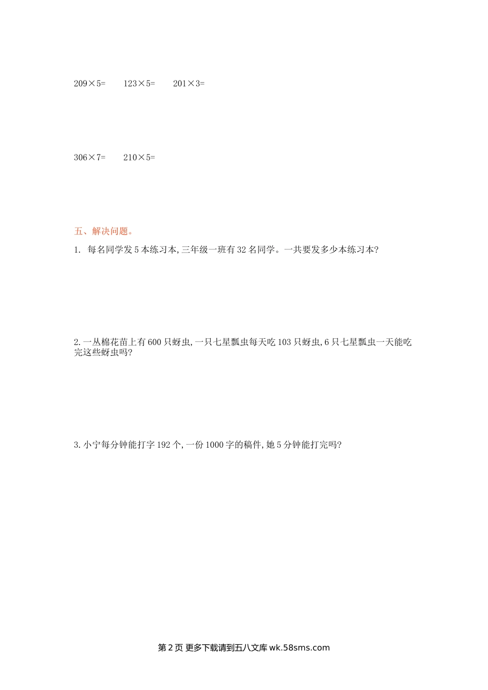 第二单元测试卷一、填空题。1.三位数乘一位数的积可能是()位数,也可能是()位数。2.480×5的积的末尾有()个0,605×5的积的中间有()个0。3.一个因数是104,另一个因数是7,积是()。4.0与任何数相乘都得(),203×5×0的...
