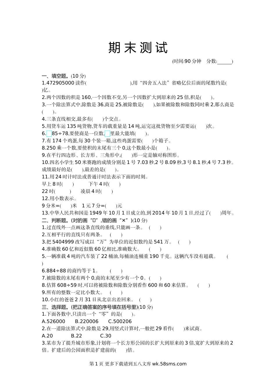 期末测试(时间:90分钟分数:)一、填空题。(10分)1.472905000读作(),用“四舍五入法”省略亿位后面的尾数约是()亿。2.两个因数的积是160,一个因数不变,另一个因数扩大到原来的25倍,积是()。3.一个除法算式中,除数是...