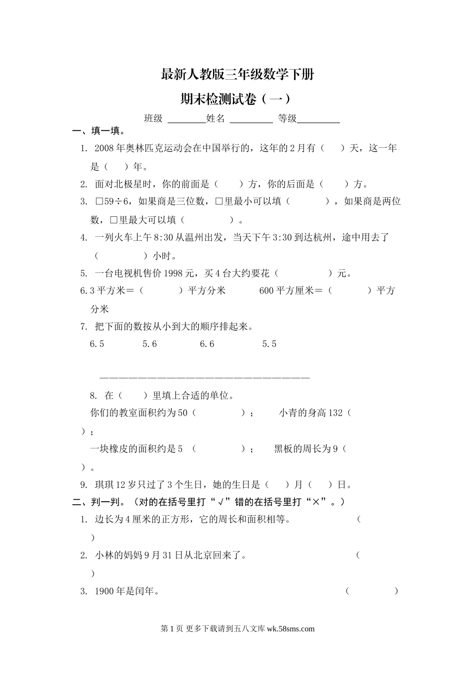 最新人教版三年级数学下册期末检测试卷(一)班级姓名等级一、填一填。1.2008年奥林匹克运动会在中国举行的,这年的2月有()天,这一年是()年。2.面对北极星时,你的前面是()方,你的后面是()方。3.□59÷...