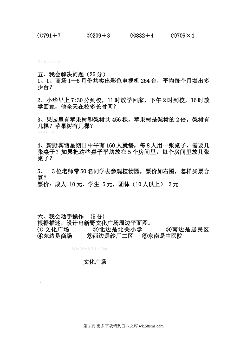 三年级数学下册期中测试卷班级:姓名:成绩:一、我会填空(24分)1、地图上是按上()下()左()右()绘制的。2、要使□64÷5的商是两位数,“□”中最大能填();要使664÷□的商是两位数,“□”中最小能...