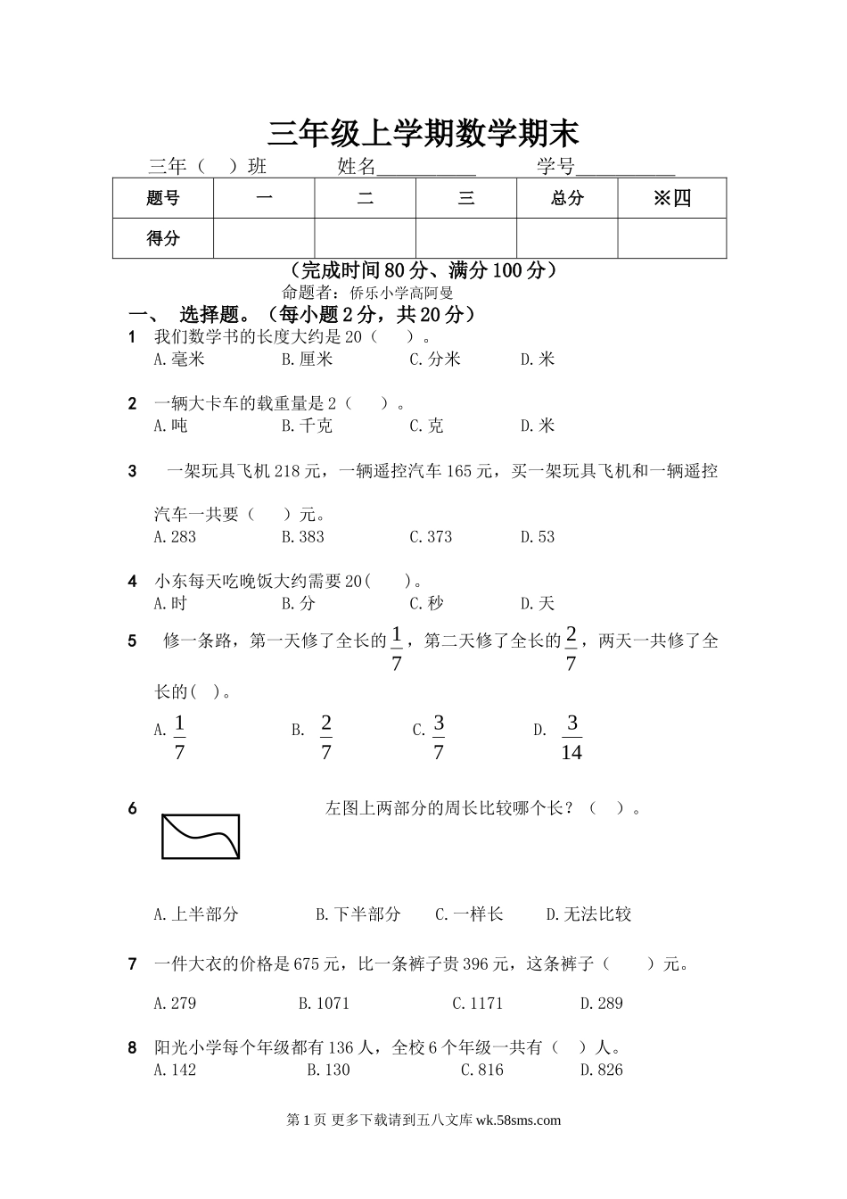 三年级上学期数学期末三年()班姓名_____学号_____题号一二三总分※四得分(完成时间80分、满分100分)命题者:侨乐小学高阿曼一、选择题。(每小题2分,共20分)1我们数学书的长度大约是20()。A.毫...