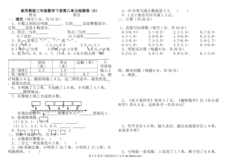 新苏教版三年级数学下册第八单元检测卷(B)姓名得分一、填空(每空1分,共33分)1、小数之间的点叫做,它的边是整数部分,它的边是小数部分。2、四点二写作零点三写作0.7读作13.5读作3、在里填上“>”、“<”或...