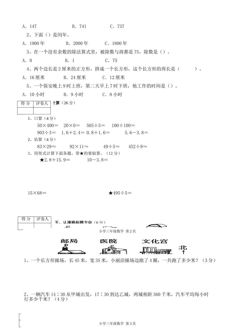 土地坳中心完小2016人教版三年级下册数学期末试卷.doc_第3页