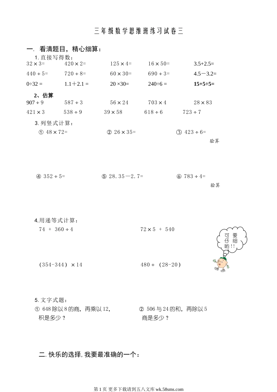 三年级数学思维班练习试卷三一.看清题目,精心细算:1.直接写得数:32×3=420×2=125×4=16×50=3.5+2.5=440÷5=720÷8=60×30=690÷3=4.5-3.2=0÷32=1.1+2.1=20×30=240÷6=15+5÷5=2、估算907÷9587÷356×24...