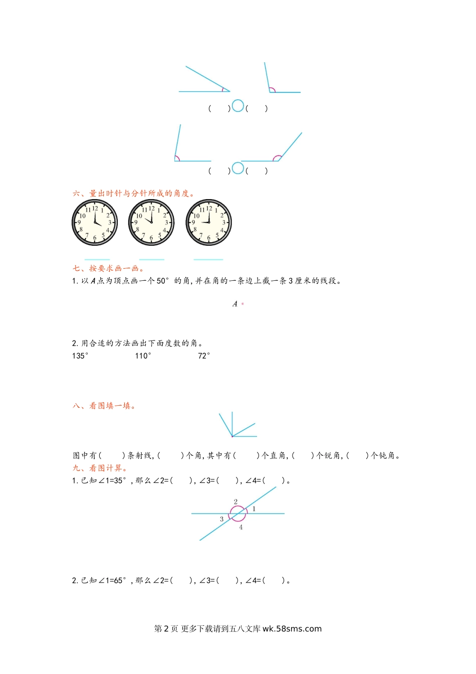第二单元测试卷(一)一、填空题。1.线段有()个端点,射线有()个端点。2.()角小于90°,大于90°而小于180°的角叫作()。3.1平角=()直角1周角=()直角1周角=()平角4.右图中,∠1与∠2组成的角是()角,如果∠1=40°,那...
