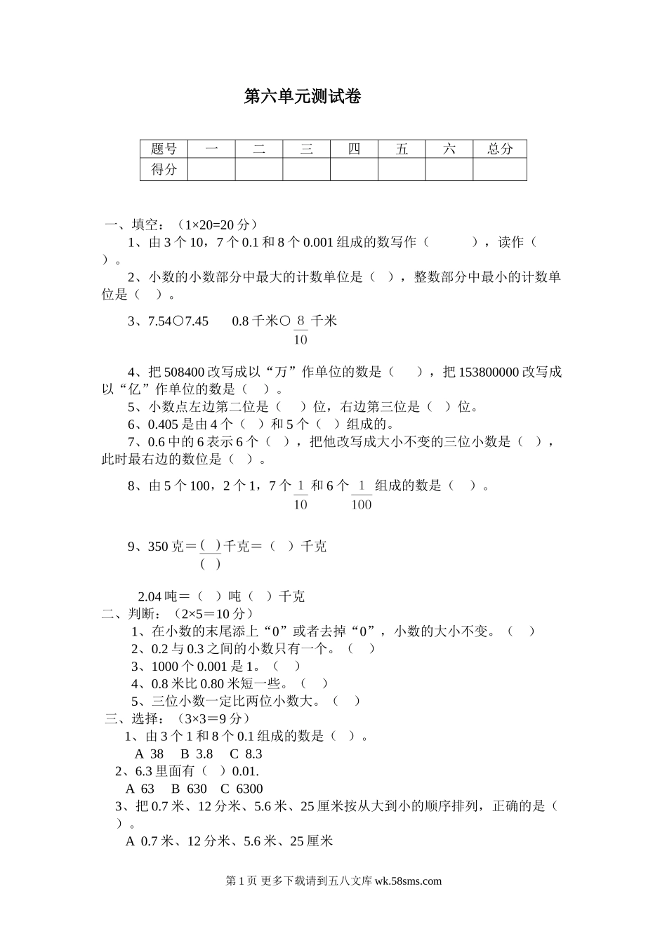 第六单元测试卷题号一二三四五六总分得分一、填空:(1×20=20分)1、由3个10,7个0.1和8个0.001组成的数写作(),读作()。2、小数的小数部分中最大的计数单位是(),整数部分中最小的计数单位是()。3、7.5...