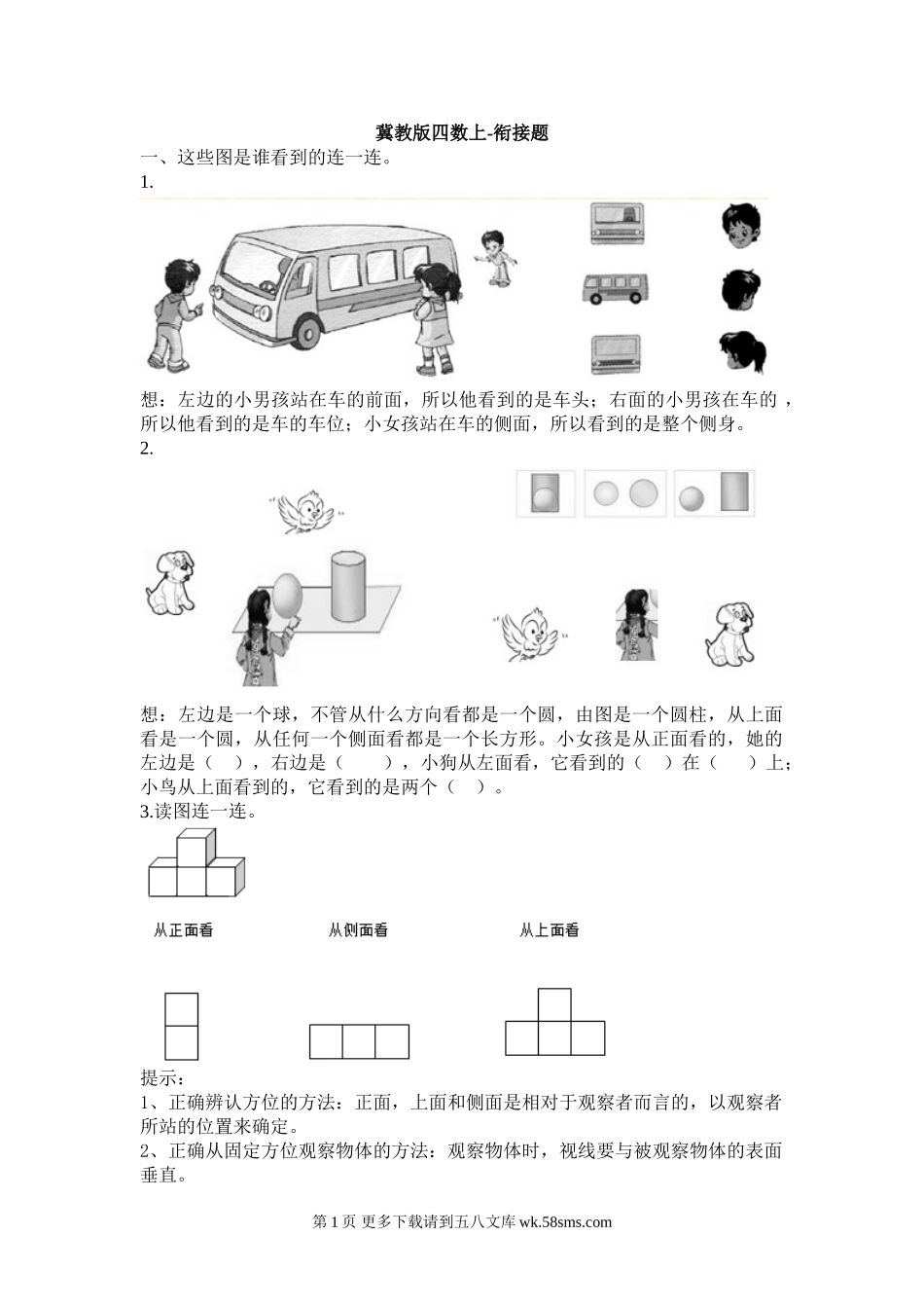 冀教版四数上-衔接题一、这些图是谁看到的连一连。1.想:左边的小男孩站在车的前面,所以他看到的是车头;右面的小男孩在车的,所以他看到的是车的车位;小女孩站在车的侧面,所以看到的是整个侧身。2.想:左边是...