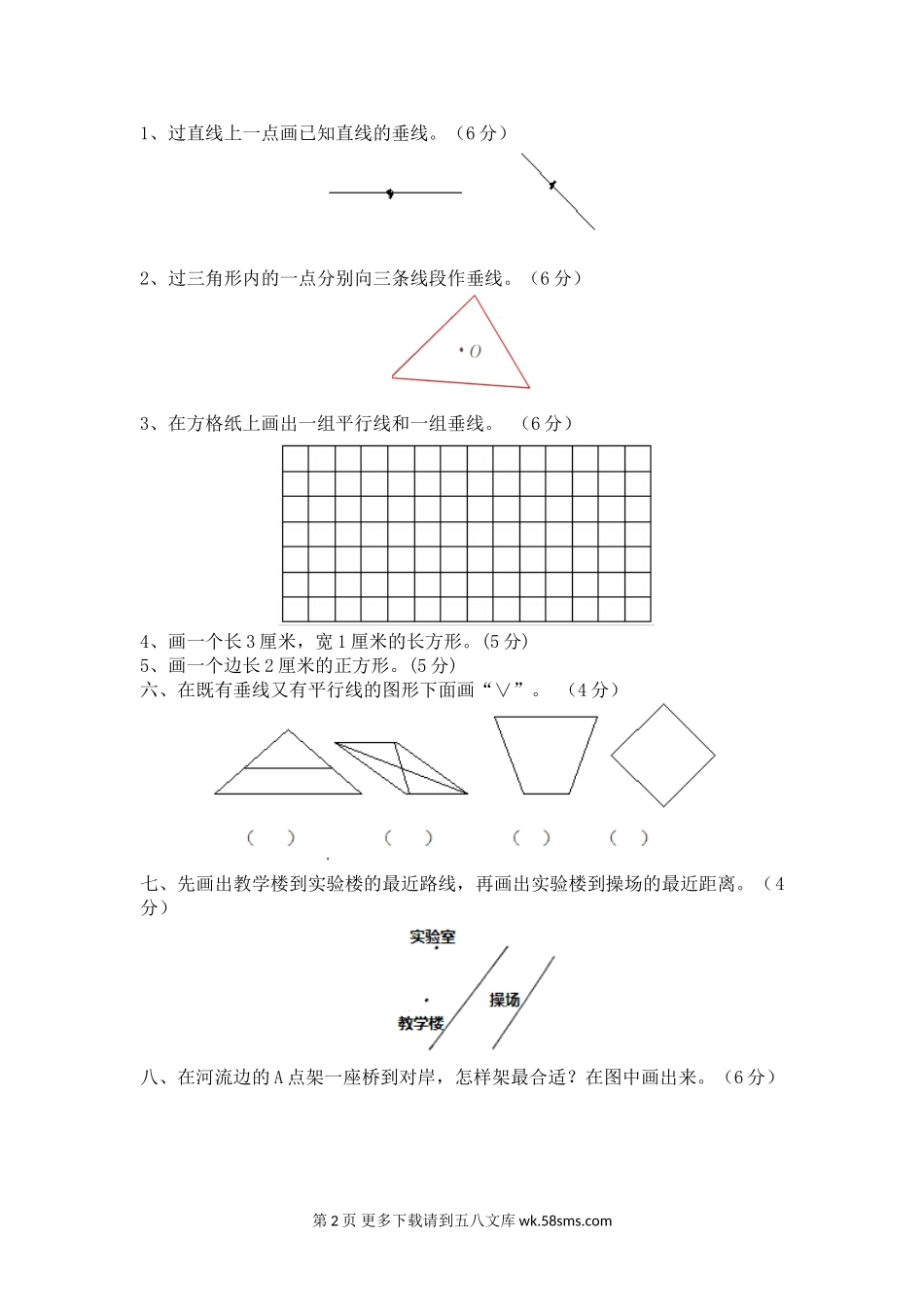 第七单元测试卷一、细心认真填一填。(34分)1、两条直线相交成()时,这两条直线互相垂直。其中一条直线叫做另一条直线的()。2、在同一平面内,不相交的两条直线叫做(),也可以说两条直线()。3、如图,点...