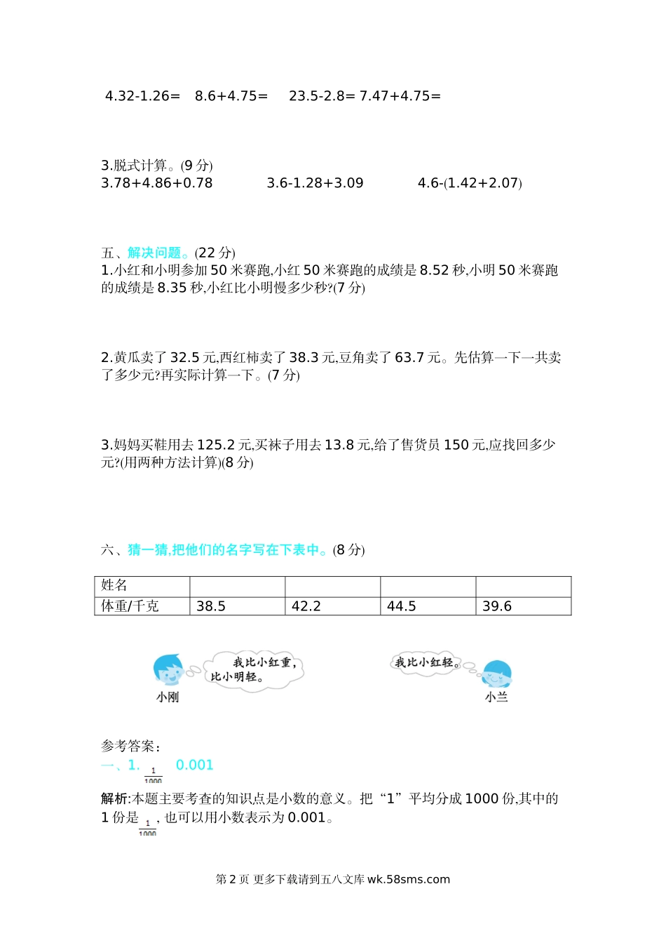 第一单元测试卷(2)时间:90分钟满分:100分数:一、我会填。(19分)1.把“1”平均分成1000份,其中的1份是(),也可以表示为()。2.0.4里面有()个0.1,0.025里面有()个0.001。3.在100.103中,“3”在()位,表示()。(导学号...