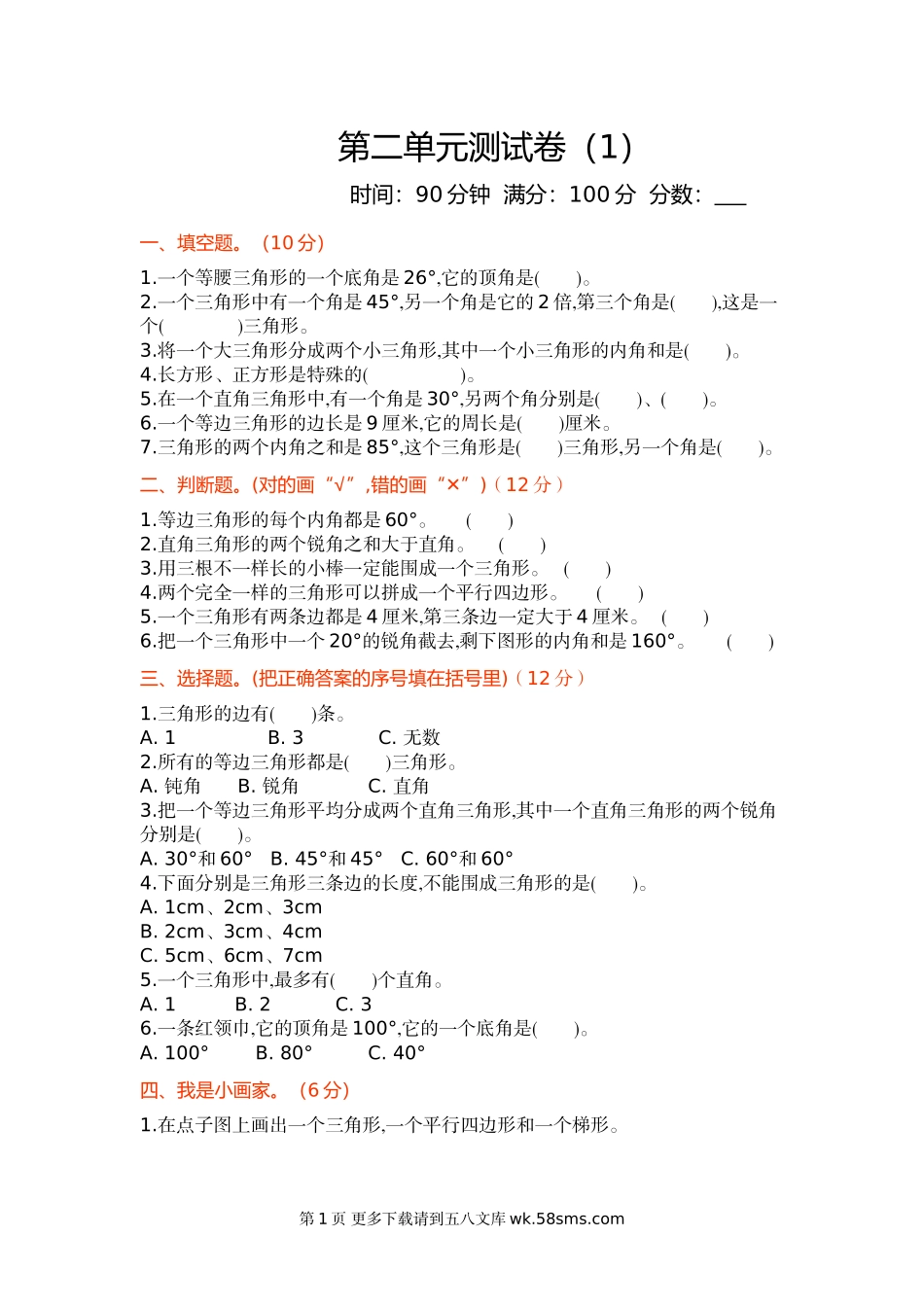 第二单元测试卷(1)时间:90分钟满分:100分分数:一、填空题。(10分)1.一个等腰三角形的一个底角是26°,它的顶角是()。2.一个三角形中有一个角是45°,另一个角是它的2倍,第三个角是(),这是一个()三角形。3.将...
