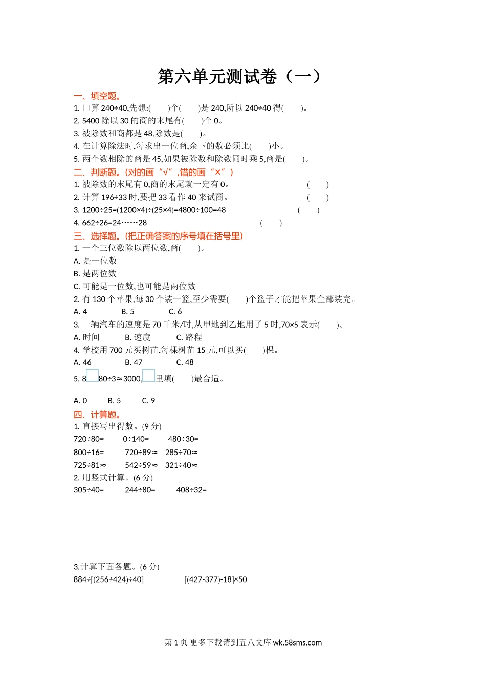 第六单元测试卷(一)一、填空题。1.口算240÷40,先想:()个()是240,所以240÷40得()。2.5400除以30的商的末尾有()个0。3.被除数和商都是48,除数是()。4.在计算除法时,每求出一位商,余下的数必须比()小。5.两个数...