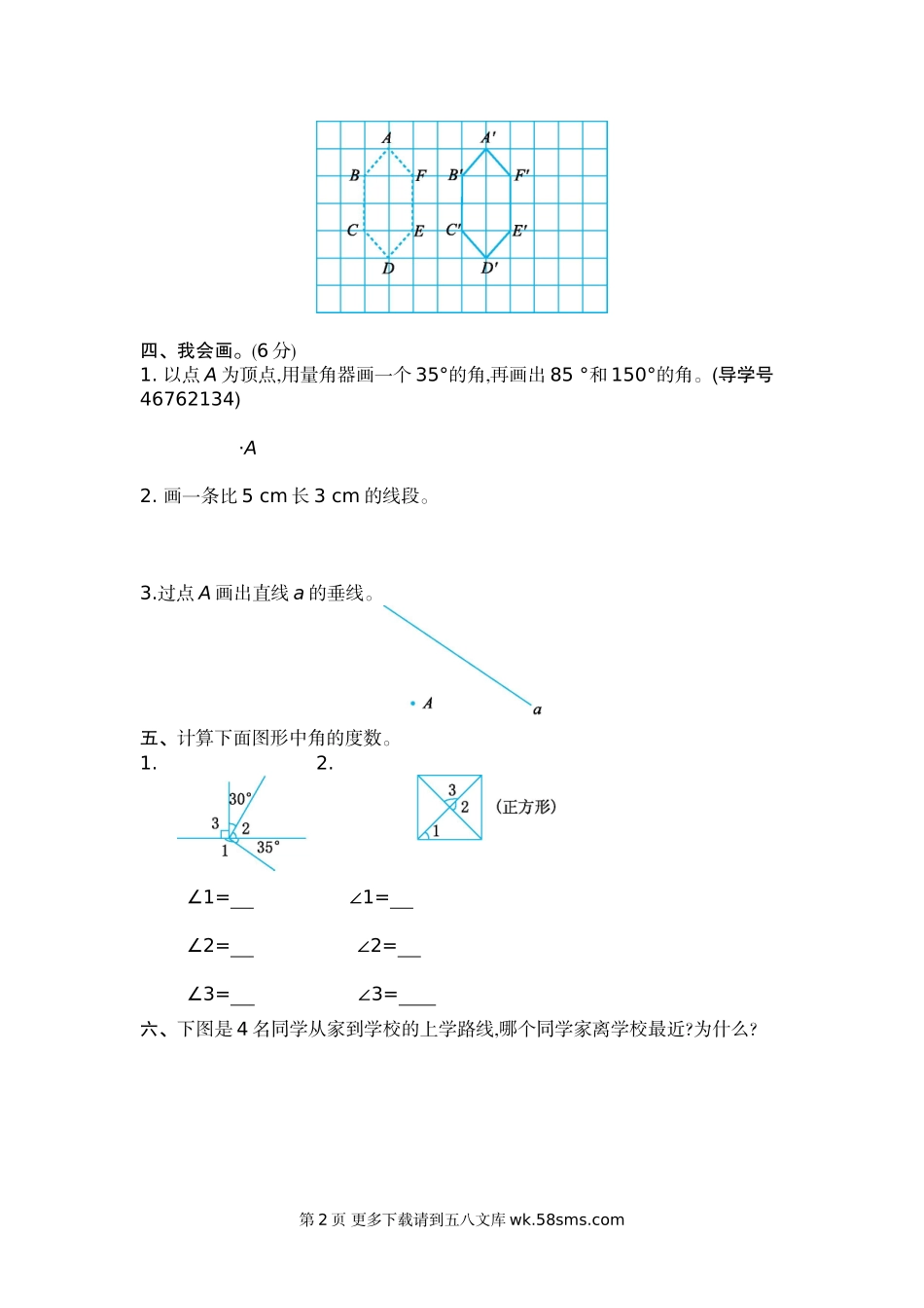 第二单元测试卷(二)一、我会填。1.角是从一点引出的两条()所组成的图形,这一点是角的(),两条射线是角的()。2.过一点可以画()条直线,以两点为端点可以画()条线段,从一点出发可以画()条射线。3.角的大小与所画角...