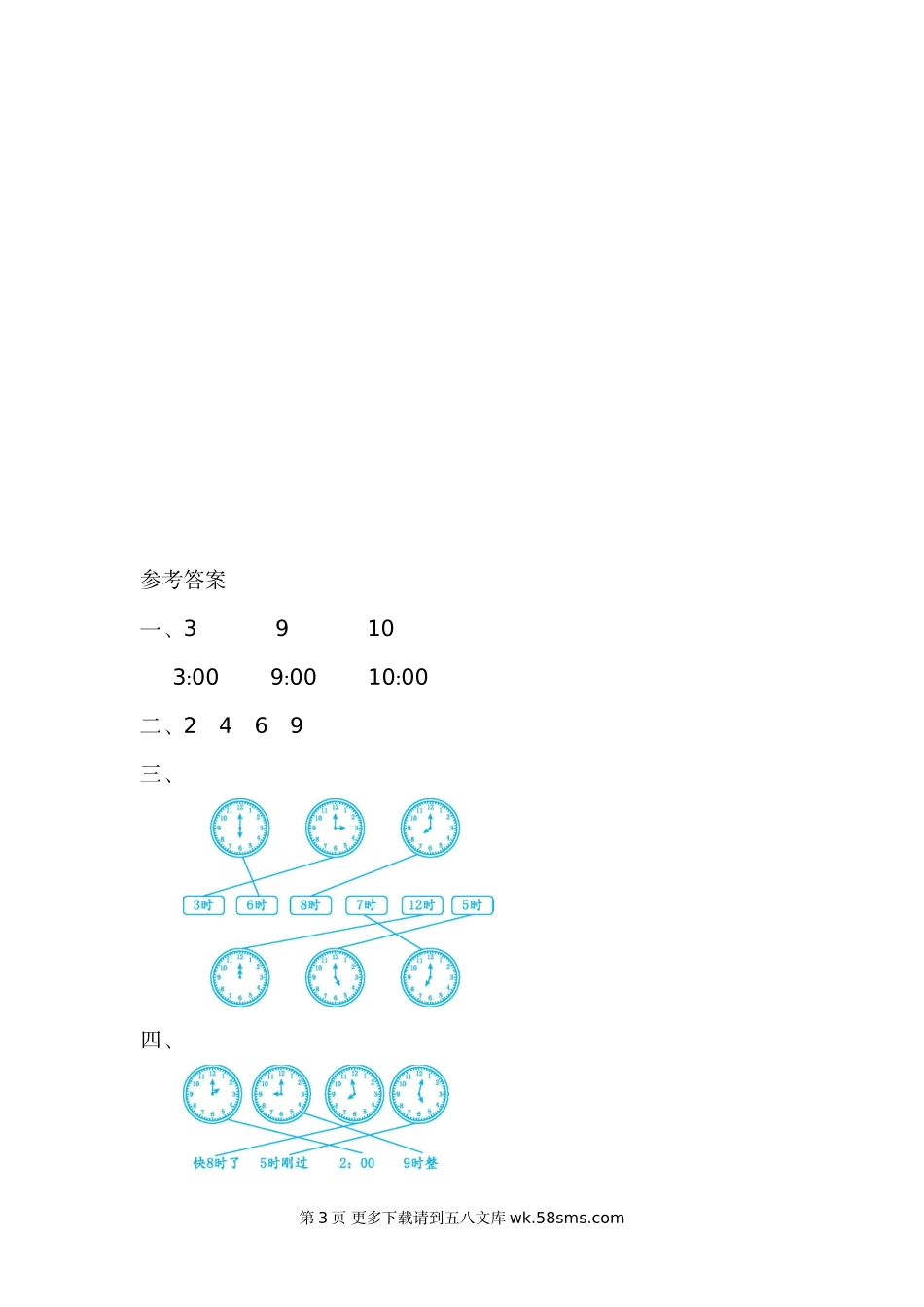 第八单元测试卷(二)一、读出下面钟面上的时间,并用两种方法写出这个时刻。:::二、认真观察,填时间。三、连一连。四、连一连。第1页更多下载请到五八文库wk.58sms.com五、钟表再走1时是几时?六、找规律,在第4个...