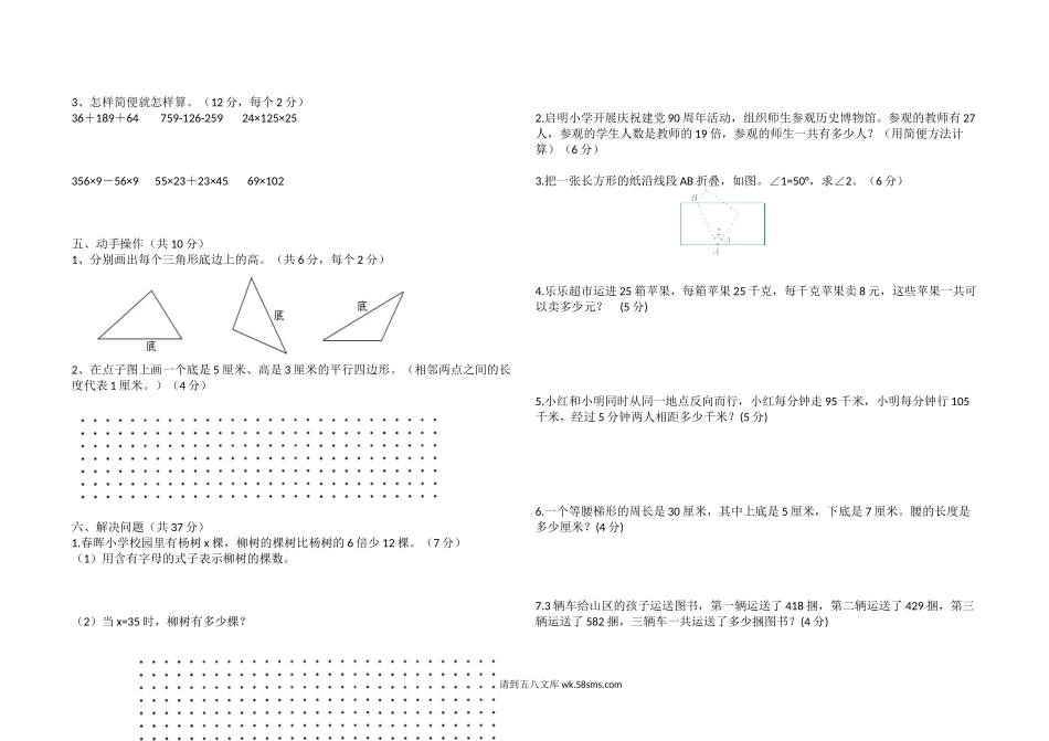 2018-2019学年度下学期期中考试四年级数学试题(附答案)一、用心填空(25分,每个1分)1.省略乘号写出下面各式。a×10=()a×a=()5×b+10×b=()2.一个菠萝重a千克,一个西瓜比这个菠萝的3倍重2千克,西瓜重...
