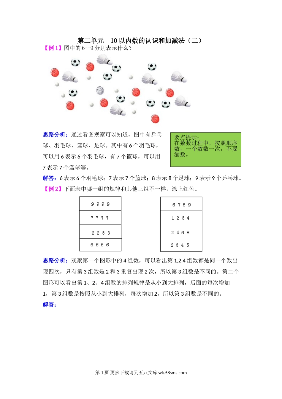 第二单元10以内数的认识和加减法(二)【例1】图中的6--9分别表示什么?思路分析:通过看图观察可以知道,图中有乒乓球、羽毛球、篮球、足球。其中有6个羽毛球,可以用6表示6个羽毛球,有7个篮球,可以用7表示7个...