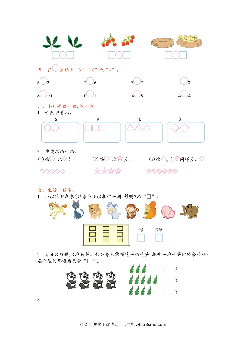 第一单元测试卷(一)一、照样子,看数圈一圈。937845二、数一数,写一写。三、想一想,填一填。1.按顺序填数。2.(1)(2)()和()合起来是()。()和()合起来是()。3.照样子,填一填。4.(1)小马的车上一共拉了()种水果。(2...