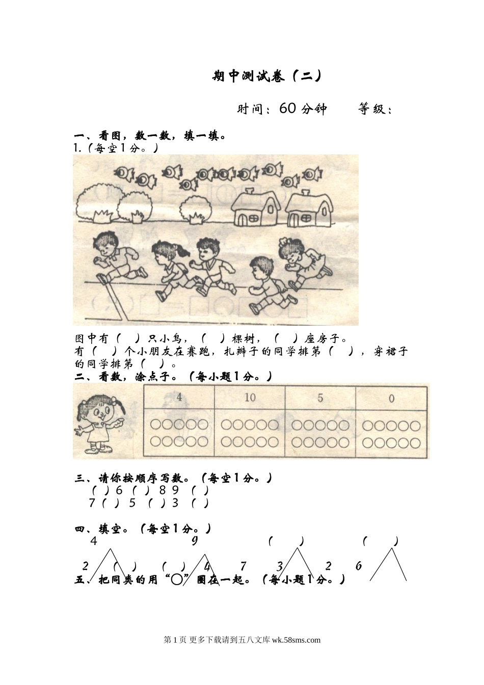 期中测试卷(二)时间:60分钟等级:一、看图,数一数,填一填。1.(每空1分。)图中有()只小鸟,()棵树,()座房子。有()个小朋友在赛跑,扎辫子的同学排第(),穿裙子的同学排第()。二、看数,涂点子...
