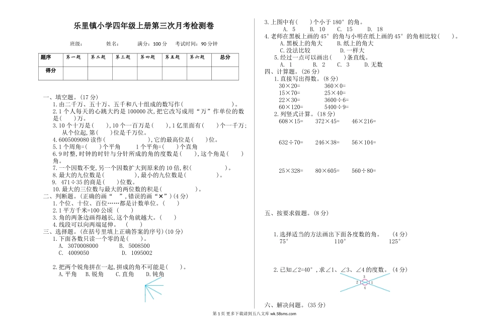 乐里镇小学四年级上册第三次月考检测卷班级:姓名:满分:100分考试时间:90分钟题序第一题第二题第三题第四题第五题第六题总分得分一、填空题。(17分)1.由二千万、五十万、五千和八十组成的数写作()。2.1个人每...