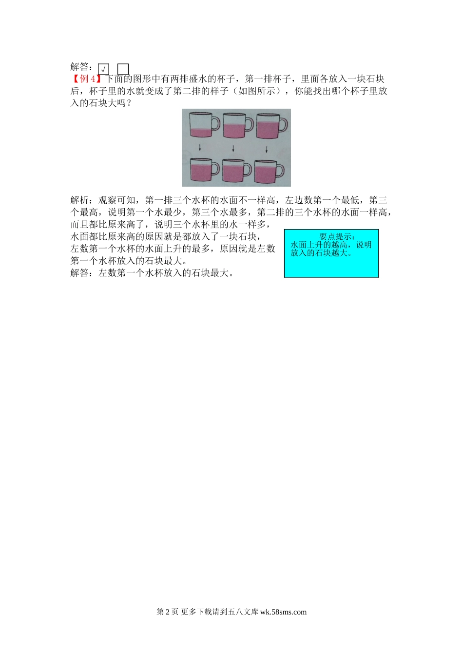 第二单元分类与比较【例1】最长的画“√”,最短的画“”。解析:主要考查物体长短的比较方法。关键是要明确比较物体长短时一端要对齐。观察可知,图中有三根绳子,它们的左端都已经对齐,第一和第三根绳子是直的...