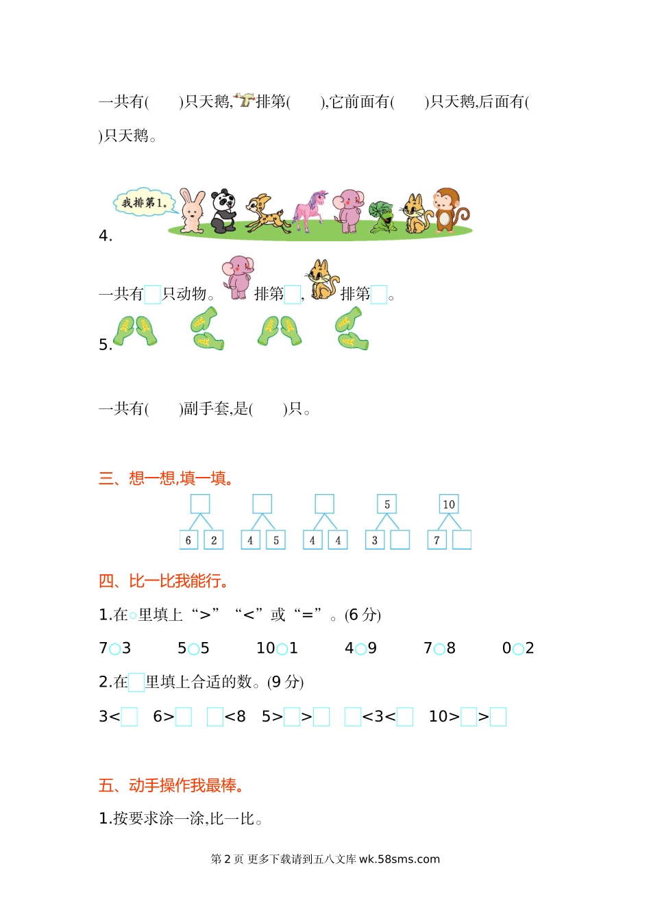 第三单元测试卷(A)一、按要求做一做。1.看数圈一圈。2.看数画出缺少的图形。二、想一想,填一填。1.2.数一数,比一比。3.第1页更多下载请到五八文库wk.58sms.com一共有()只天鹅,排第(),它前面有()只天鹅,后面有()只...