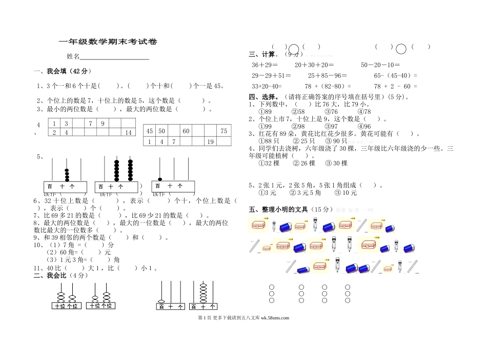 一年级数学期末考试卷姓名一、我会填(42分)1、3个一和6个十是()。()个十和()个一是45。2、个位上的数是7,十位上的数是5,这个数是()。3、最小的两位数是(),最大的两位数是()。4、5、写作()写作()写...