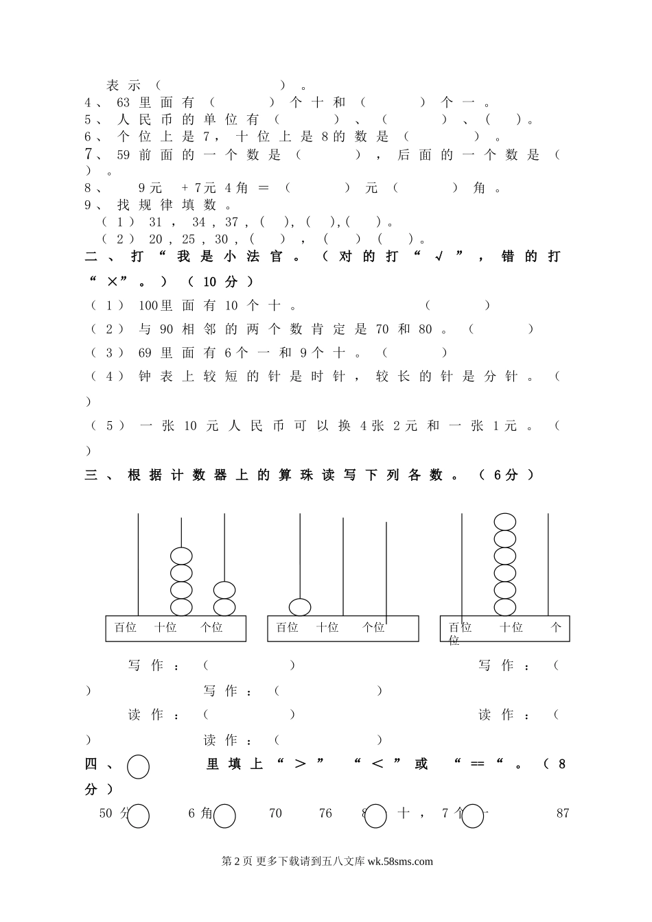 冀教版小学一年级数学下册期中测试卷.doc_第2页