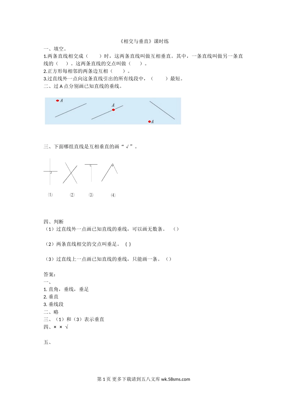 《相交与垂直》课时练一、填空。1.两条直线相交成()时,这两条直线叫做互相垂直。其中,一条直线叫做另一条直线的()。这两条直线的交点叫做()。2.正方形每相邻的两条边互相()。3.过直线外一点向这条直线...