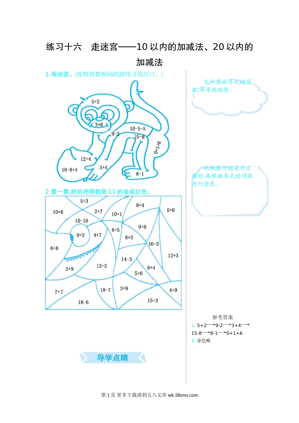 练习十六走迷宫——10以内的加减法、20以内的加减法1.闯迷宫。(按照得数相同的路线寻找出口。)2.算一算,然后把得数是11的涂成红色。先计算出算式的得数,再寻找路线。先观察可能是什么图形,再根据算式的得数进行涂...