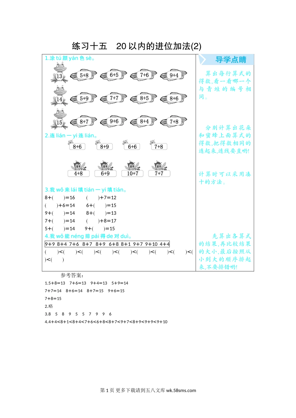 练习十五20以内的进位加法(2)1.涂tú颜yán色sè。2.连lián一yi连lián。3.我wǒ来lái填tián一yi填tián。8+()=16()+7=12()+6=146+()=159+()=148+()=137+()=14()+8=175+()=149+()=154.我wǒ能nénɡ排pái得de...