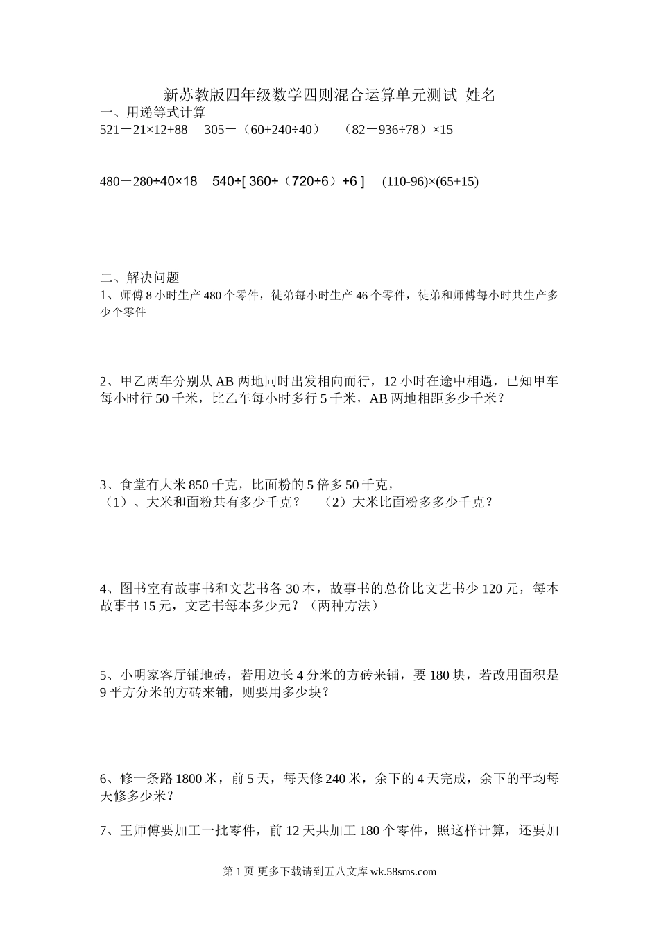 2014新苏教版四年级数学四则混合运算单元测试卷.doc_第1页
