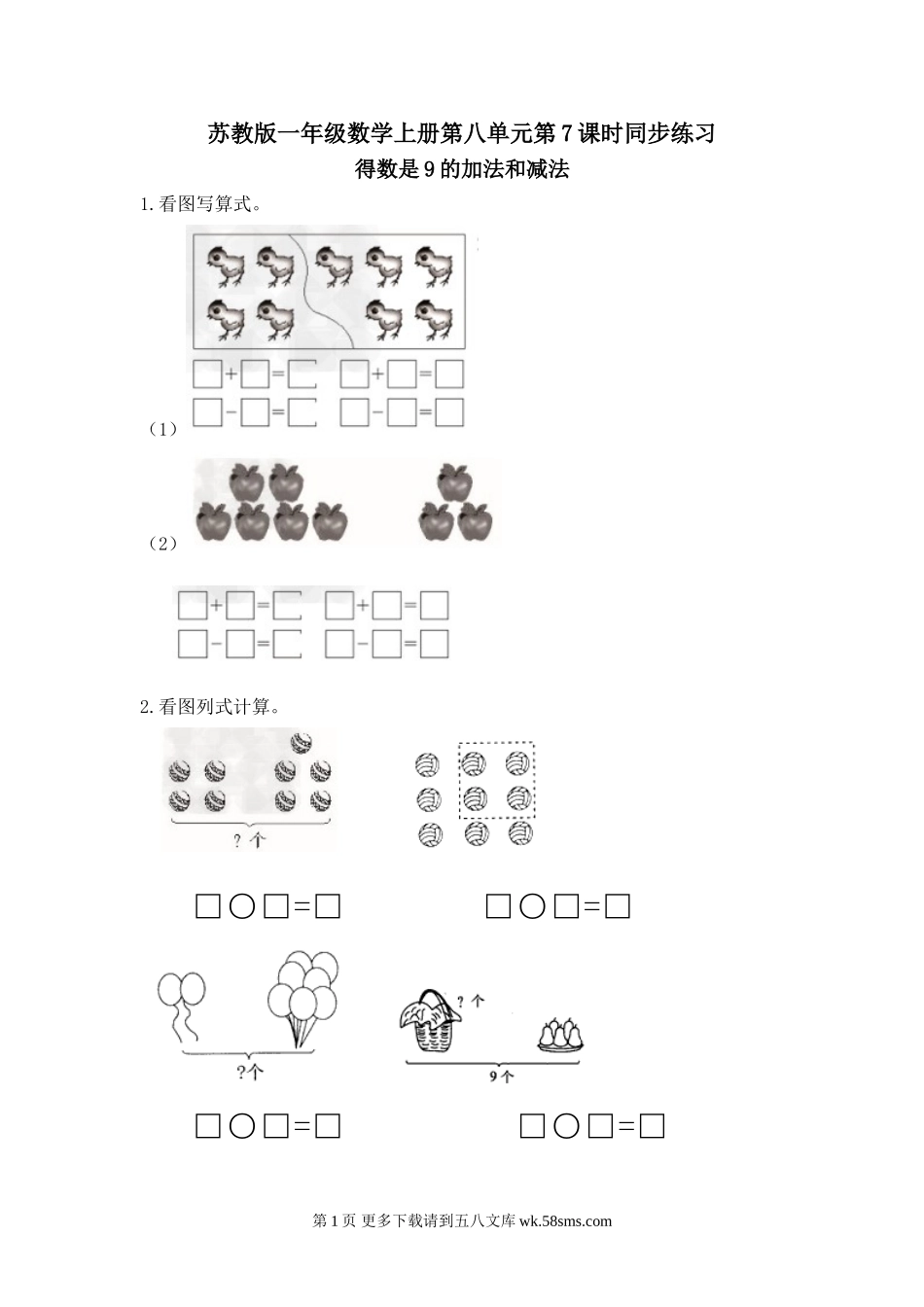 苏教版一年级数学上册第八单元第7课时同步练习得数是9的加法和减法1.看图写算式。(1)(2)2.看图列式计算。□○□=□□○□=□□○□=□□○□=□第1页更多下载请到五八文库wk.58sms.com3.帮小猫来钓鱼。(把得...