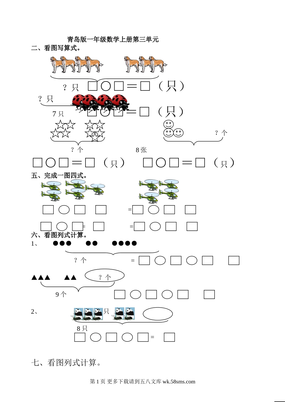 青岛版一年级数学上册第三单元二、看图写算式。?只□○□=□(只)?只7只□○□=□(只)?个?个8张□○□=□(只)□○□=□(只)五、完成一图四式。====六、看图列式计算。1、●●●●●●●●●?个=...