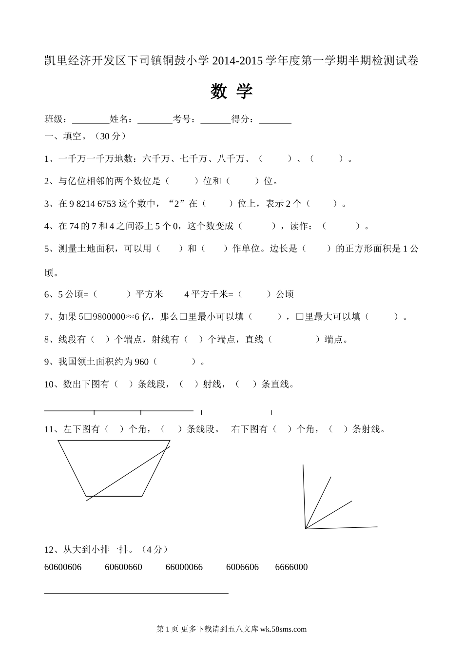 凯里经济开发区下司镇铜鼓小学2014-2015学年度第一学期半期检测试卷数学班级:姓名:考号:得分:一、填空。(30分)1、一千万一千万地数:六千万、七千万、八千万、()、()。2、与亿位相邻的两个数位是()位...