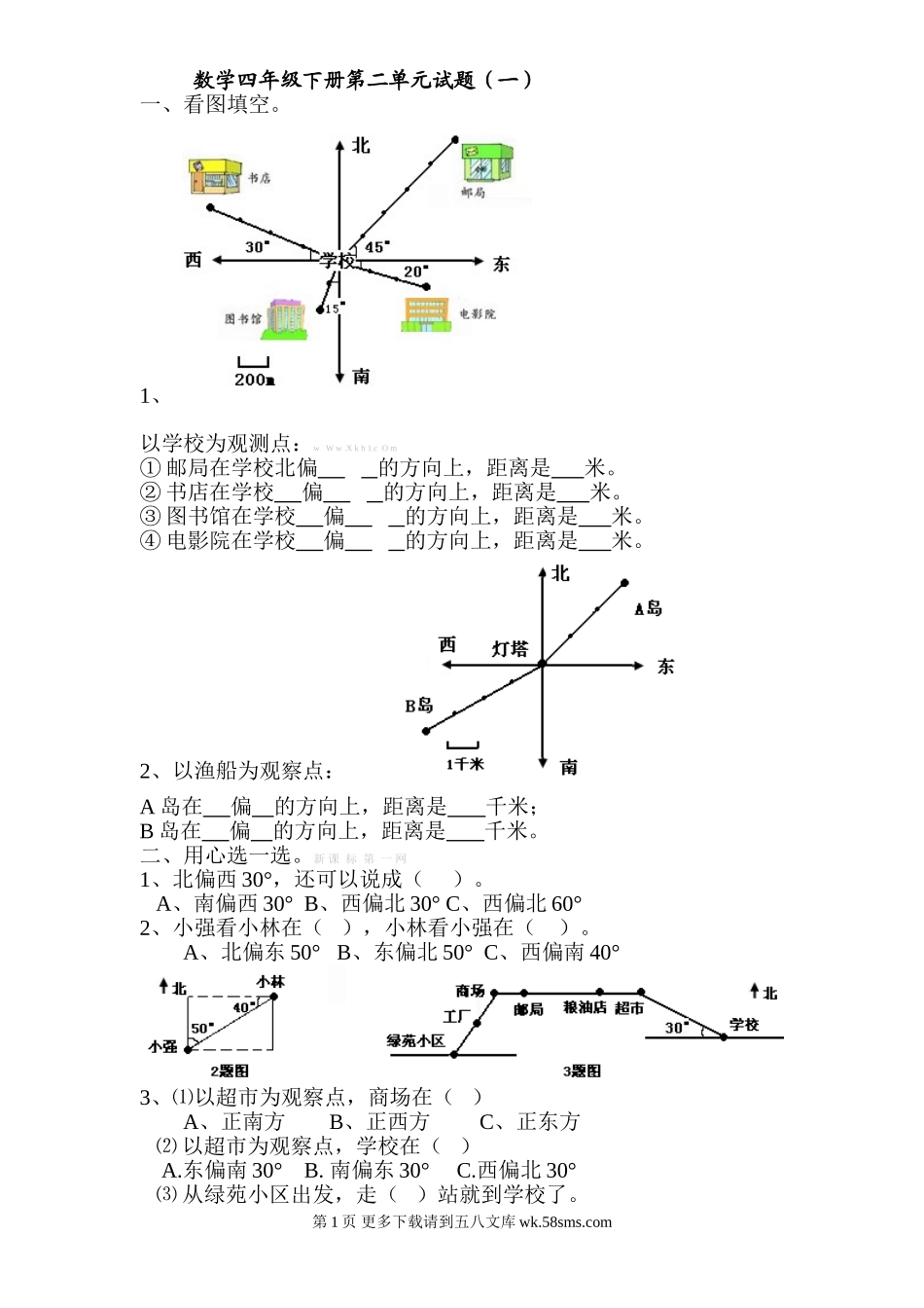 数学四年级下册第二单元试题(一)一、看图填空。1、以学校为观测点:wWw.Xkb1.cOm①邮局在学校北偏的方向上,距离是米。②书店在学校偏的方向上,距离是米。③图书馆在学校偏的方向上,距离是米。④电影院在学校...