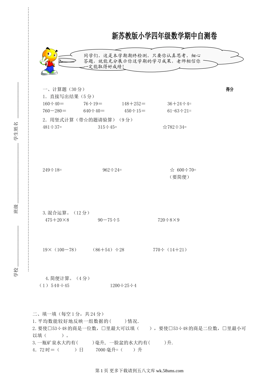 同学们,这是本学期期终检测,只要你认真思考,细心答题,就能充分展示你这学期的学习成果,老师相信你一定能取得好成绩!新苏教版小学四年级数学期中自测卷一、计算题(30分)得分1.直接写出结果(5分)160÷40...