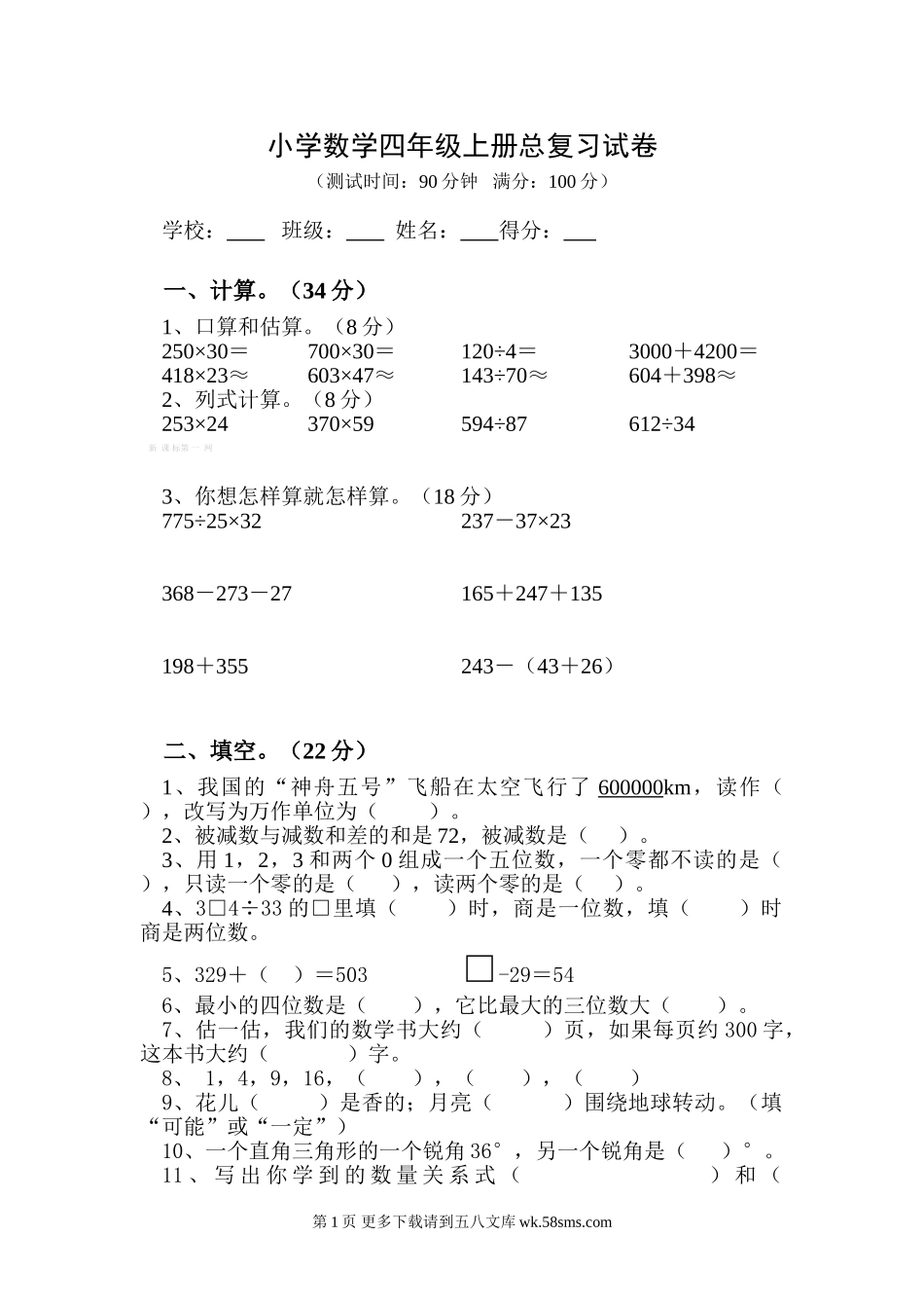 小学数学四年级上册总复习试卷(测试时间:90分钟满分:100分)学校:班级:姓名:得分:一、计算。(34分)1、口算和估算。(8分)250×30=700×30=120÷4=3000+4200=418×23≈603×47≈143÷70≈604+398...
