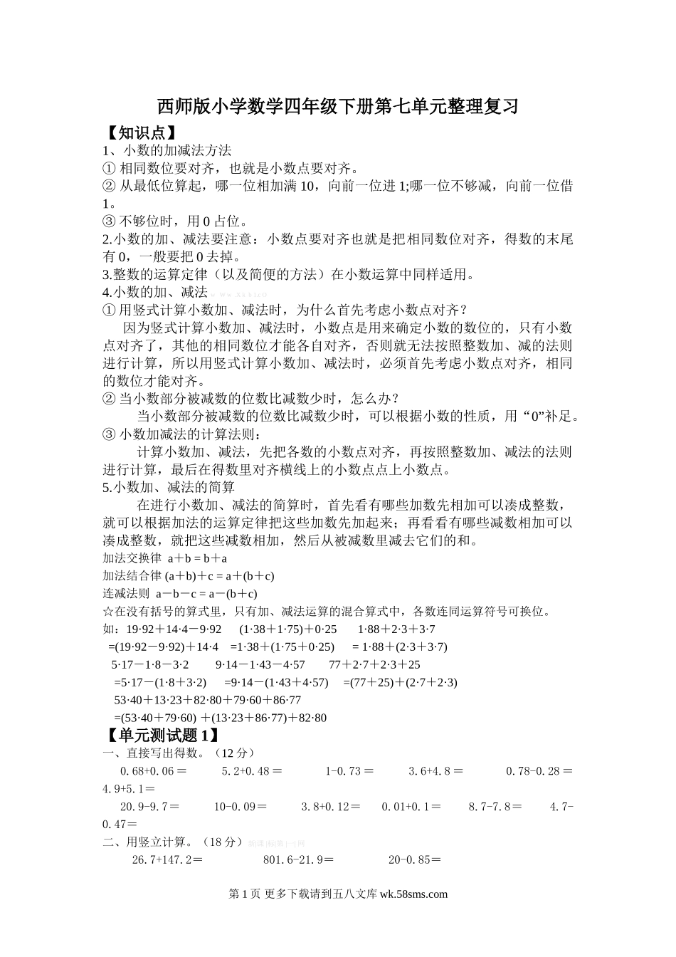 西师版小学数学四年级下册第七单元整理复习【知识点】1、小数的加减法方法①相同数位要对齐,也就是小数点要对齐。②从最低位算起,哪一位相加满10,向前一位进1;哪一位不够减,向前一位借1。③不够位时,用0占位...