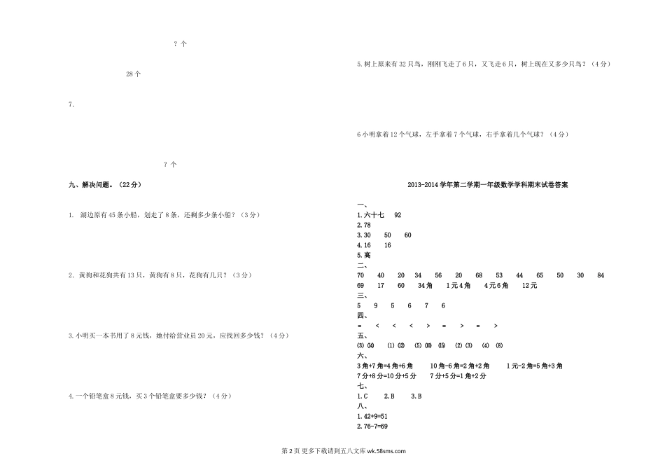 2013-2014学年第二学期小学一年级数学期末试卷及答案.doc_第2页