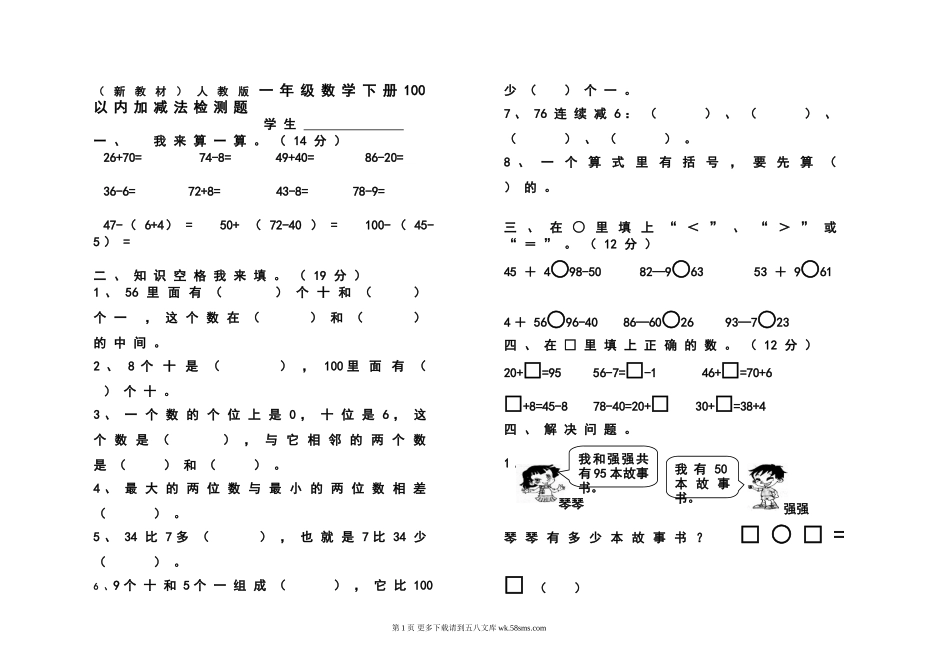 (新教材)人教版一年级数学下册100以内加减法检测题学生一、我来算一算。(14分)26+70=74-8=49+40=86-20=36-6=72+8=43-8=78-9=47-(6+4)=50+(72-40)=100-(45-5)=二、知识空格我来填。(19分)1、56里面有...