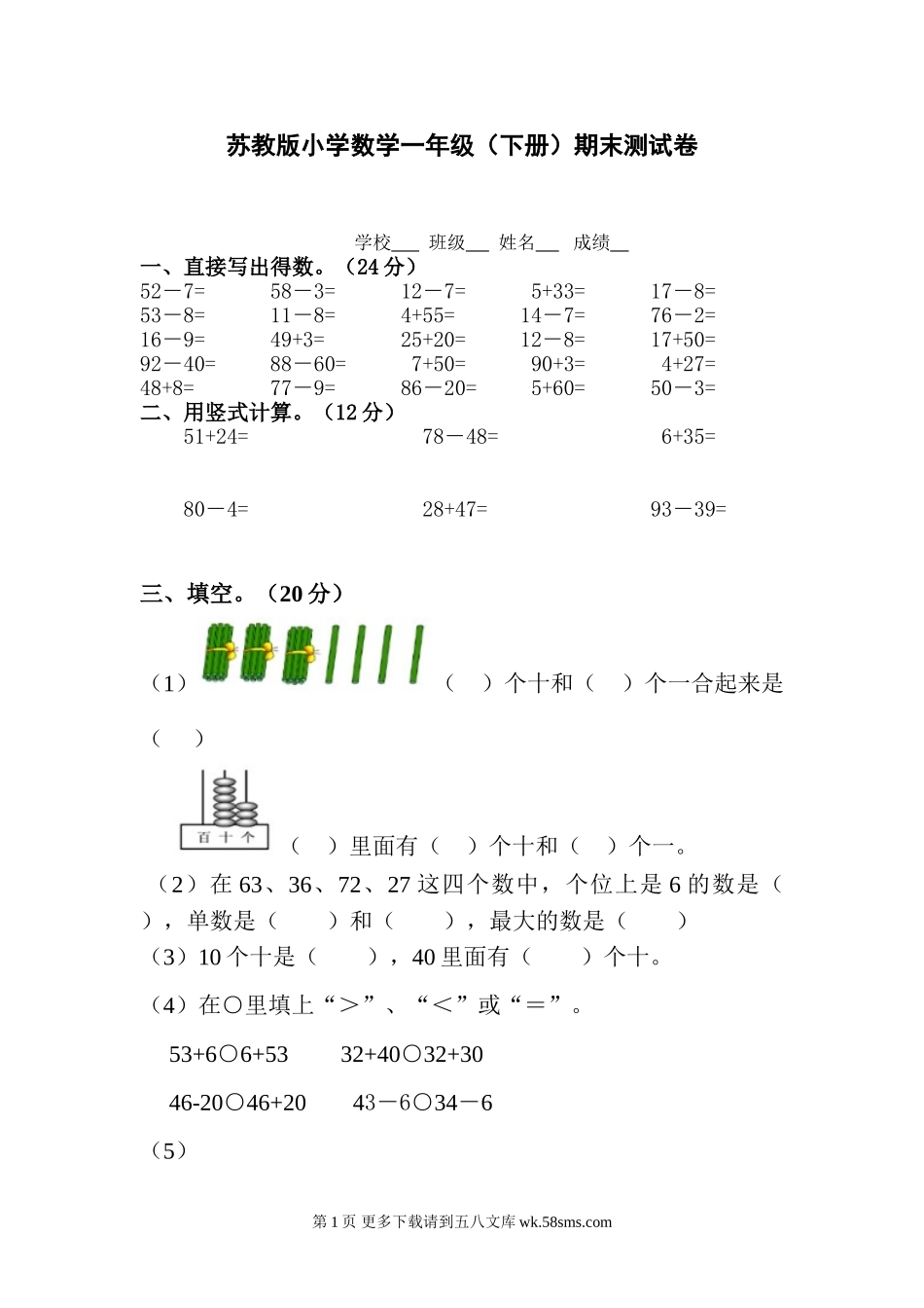 苏教版小学数学一年级(下册)期末测试卷学校班级姓名成绩一、直接写出得数。(24分)52-7=58-3=12-7=5+33=17-8=53-8=11-8=4+55=14-7=76-2=16-9=49+3=25+20=12-8=17+50=92-40=88-60=7+50=90+3=4+27=4...