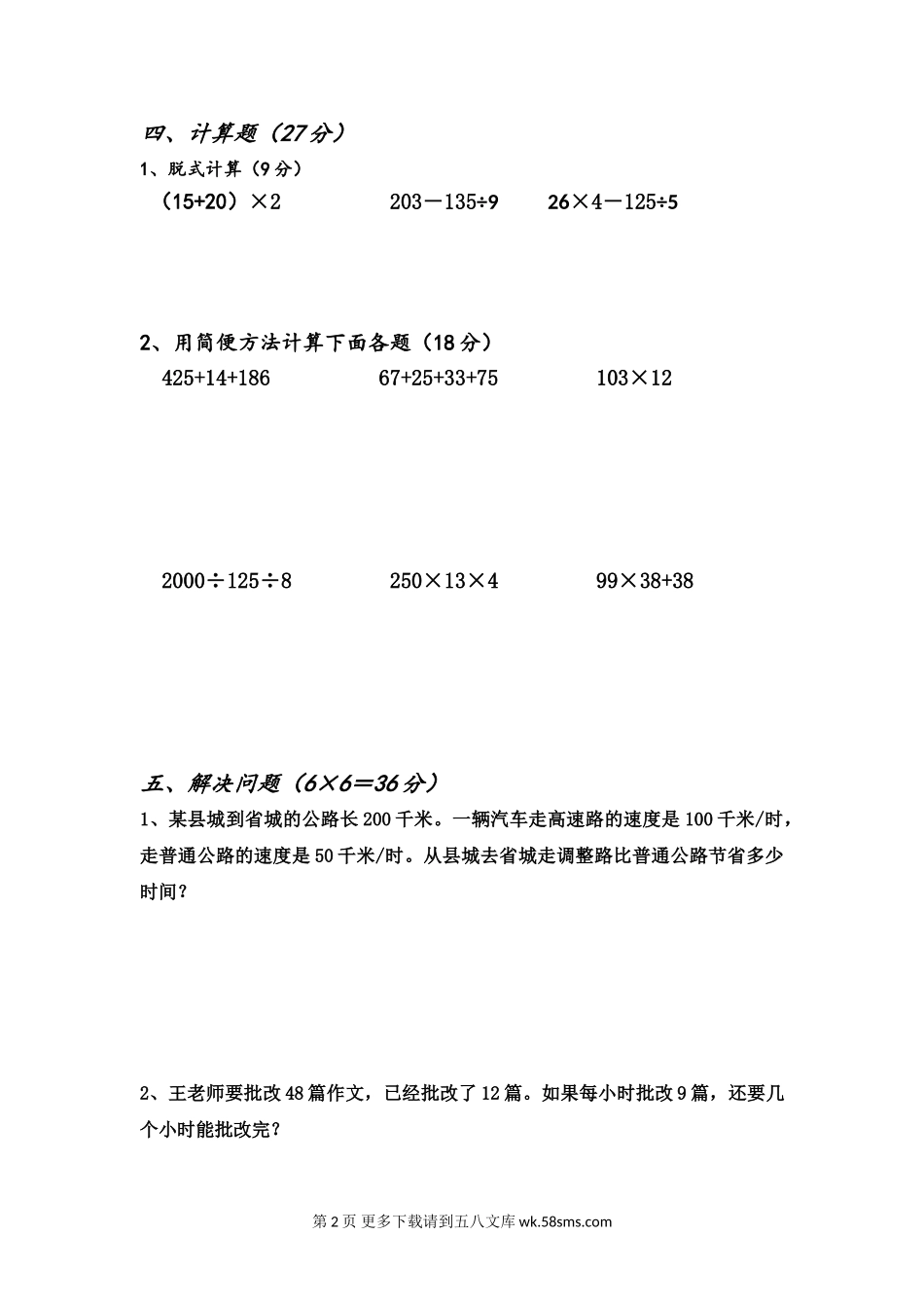 四年级下册数学期中考试卷.doc_第2页