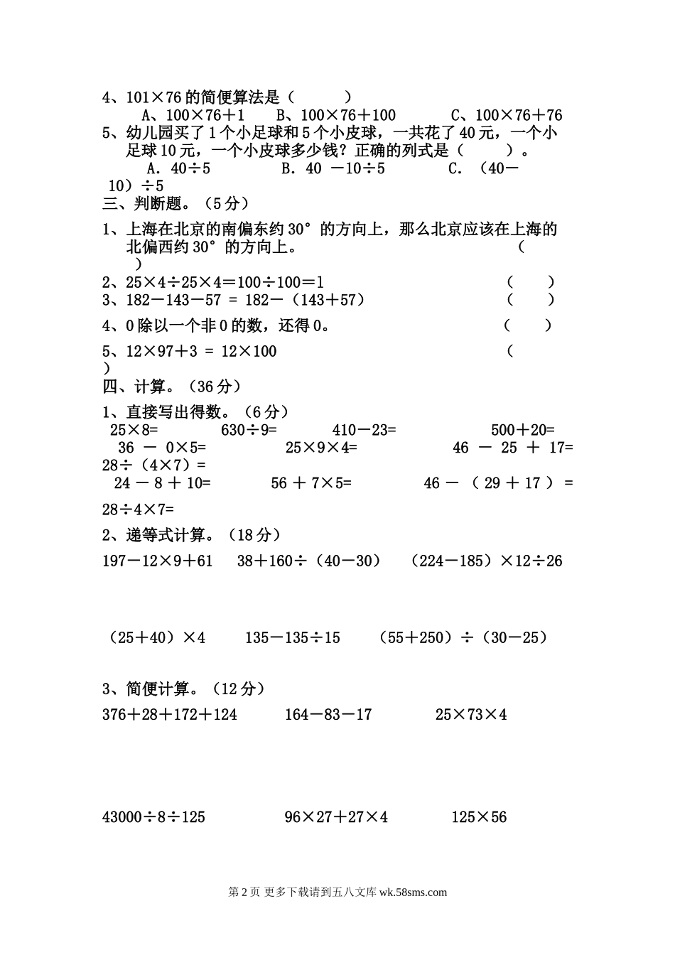 2009―2010学年度第二学期石碣实验小学数学科四年级下册期中自查试卷(P1—55)班级:姓名:成绩:____________题次一二三四五六总分得分一、填空。(共18分,每空1分。)1、0.75读作();三十四点零七写作()...